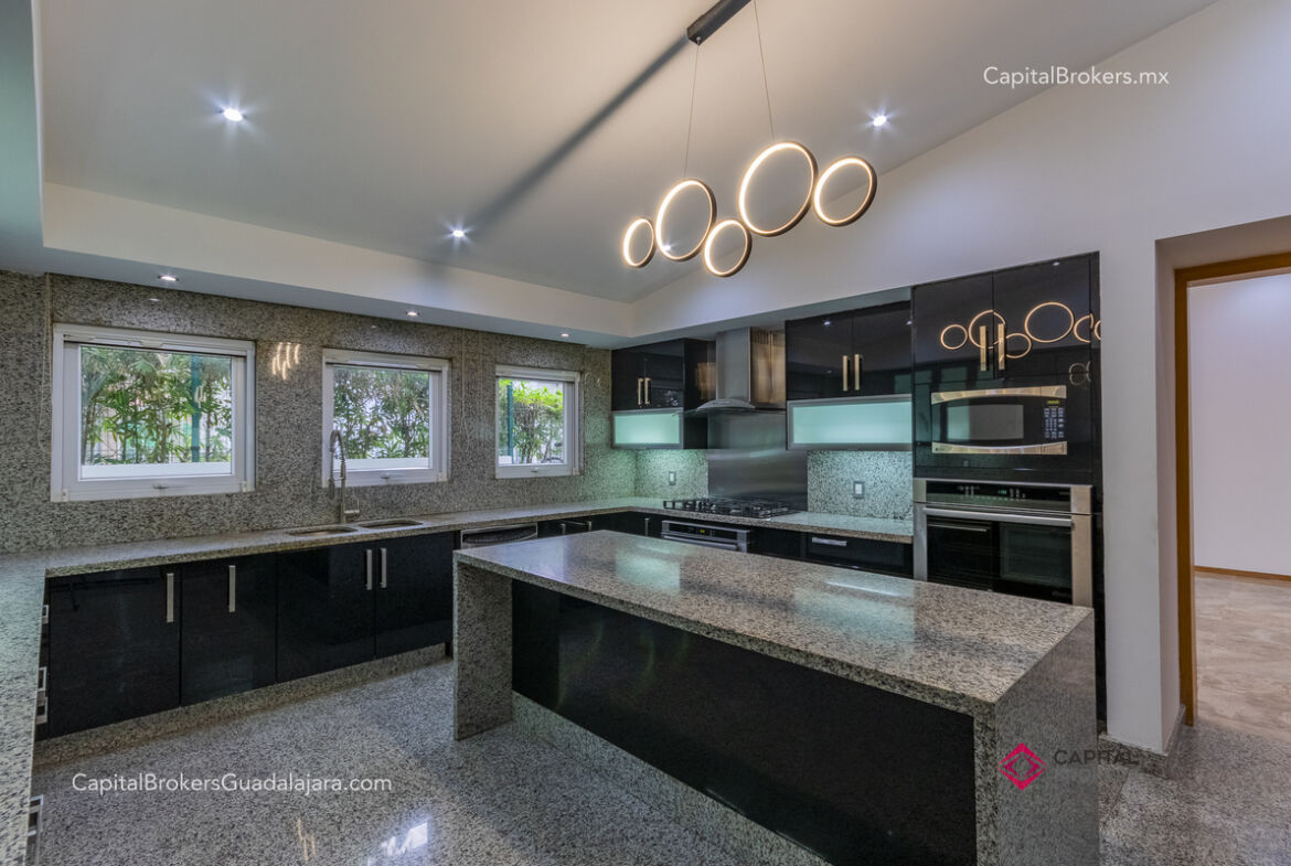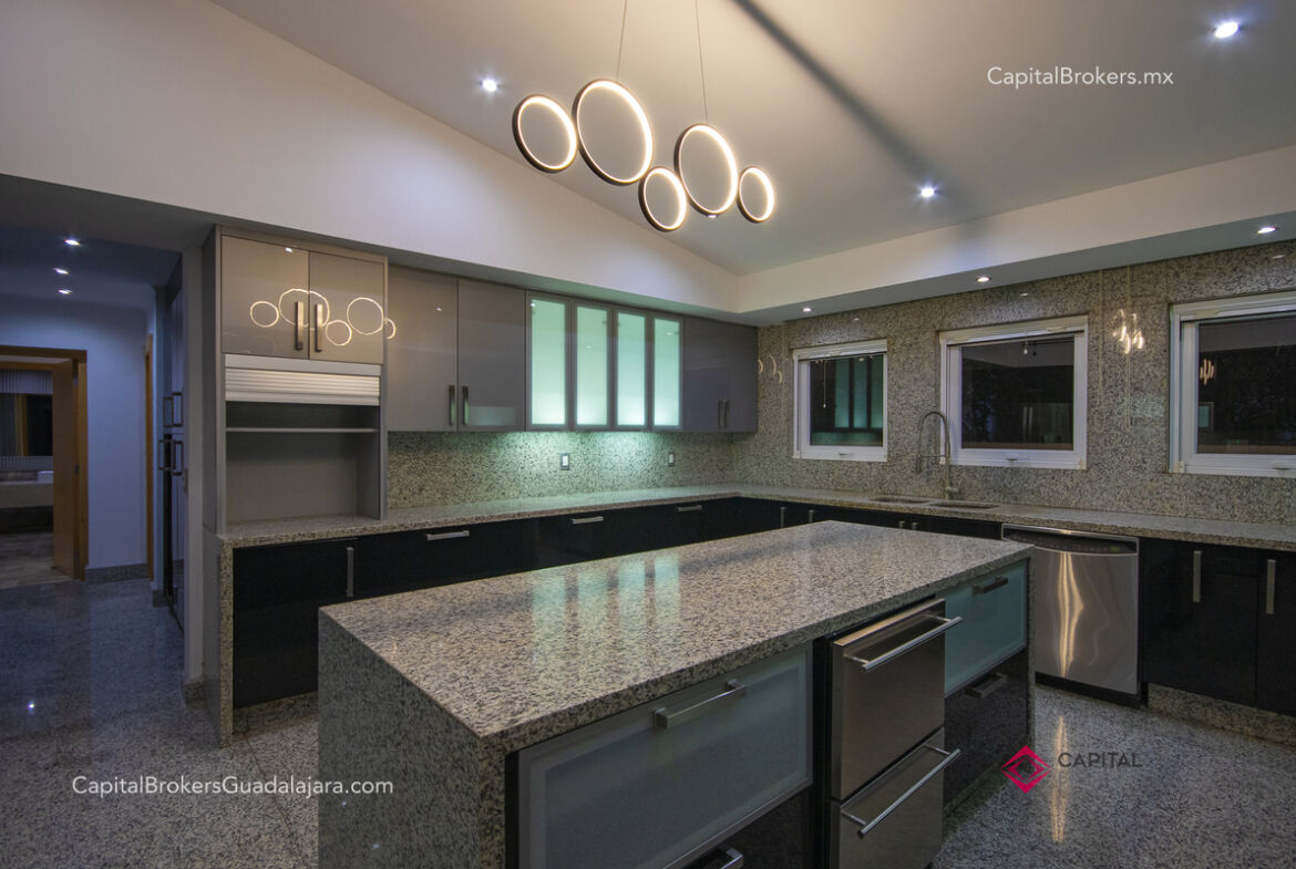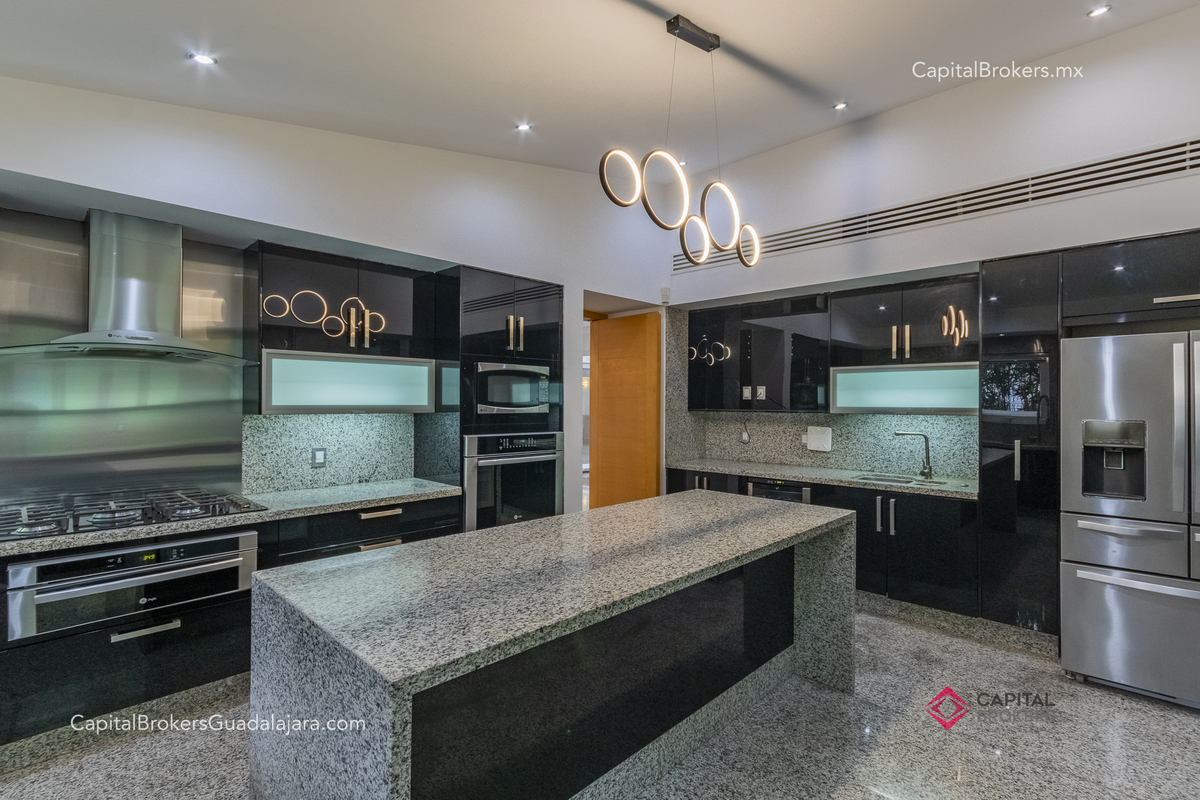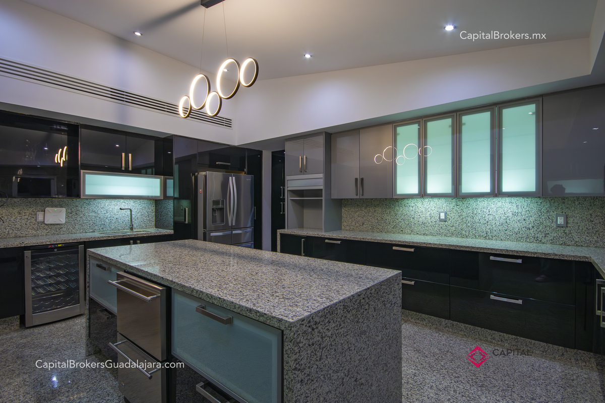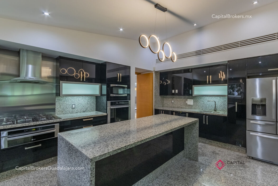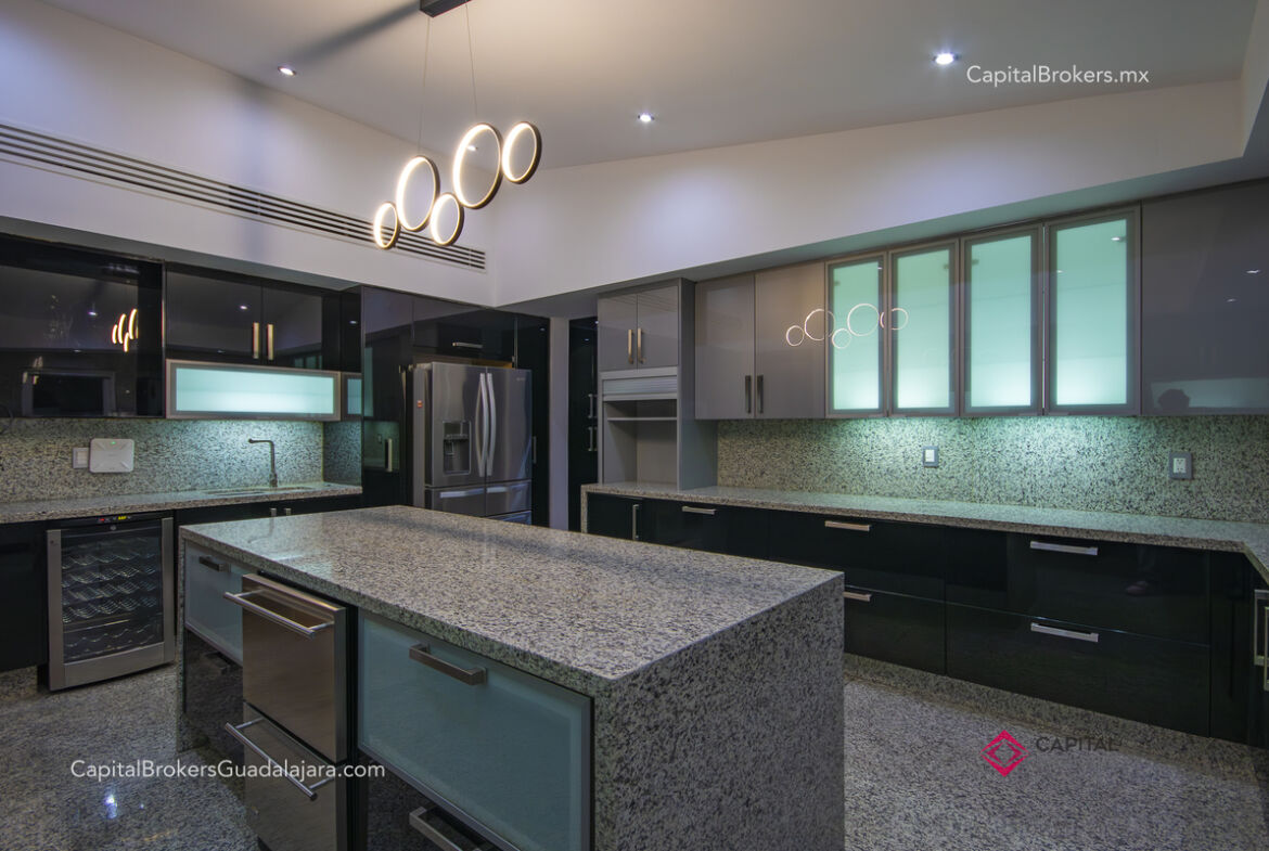 Cocina totalmente equipada con refrigerador, 3 hornos, cajón frío, cajón caliente, lavavajillas, enfriador de vinos, barra desayunadora y comedor