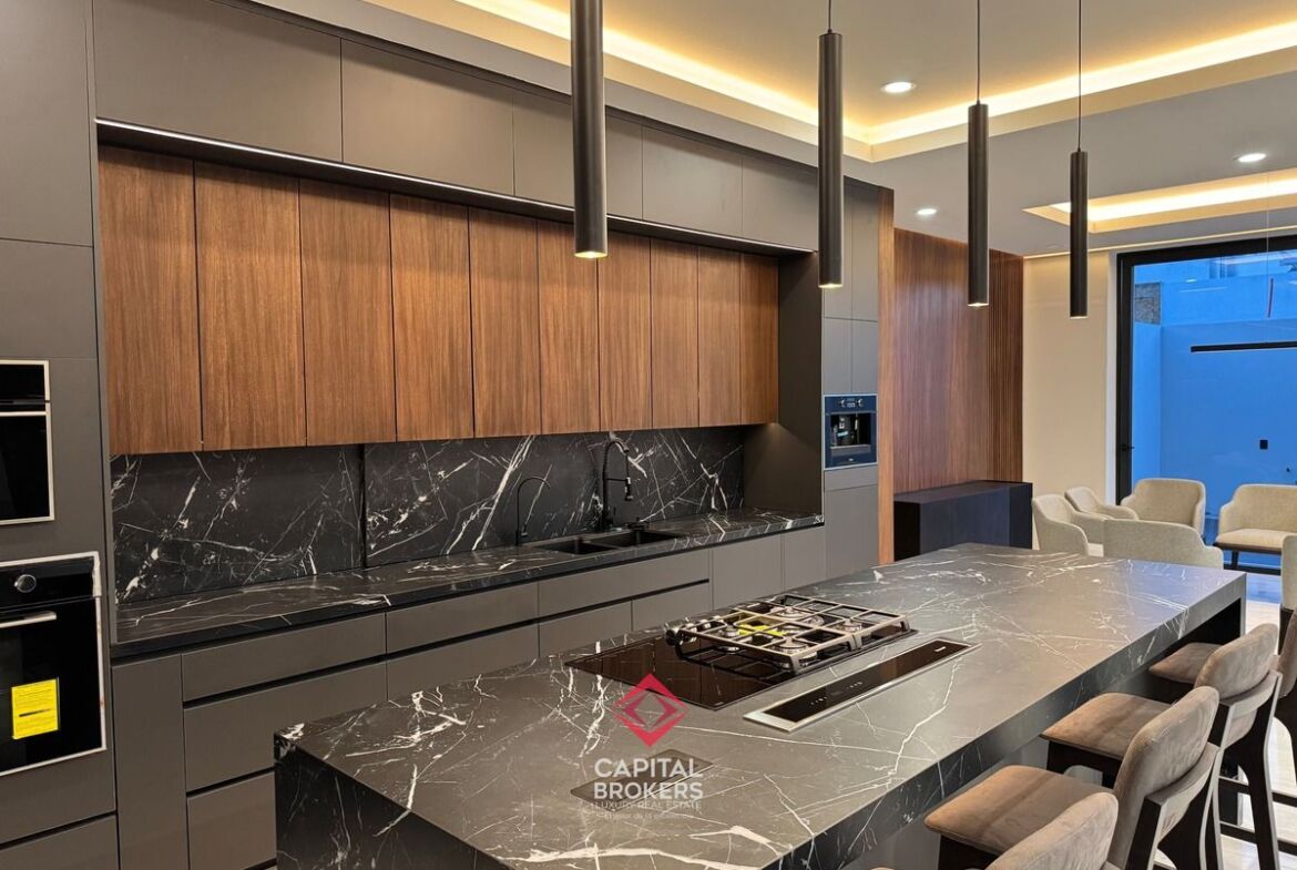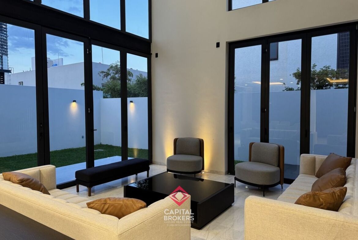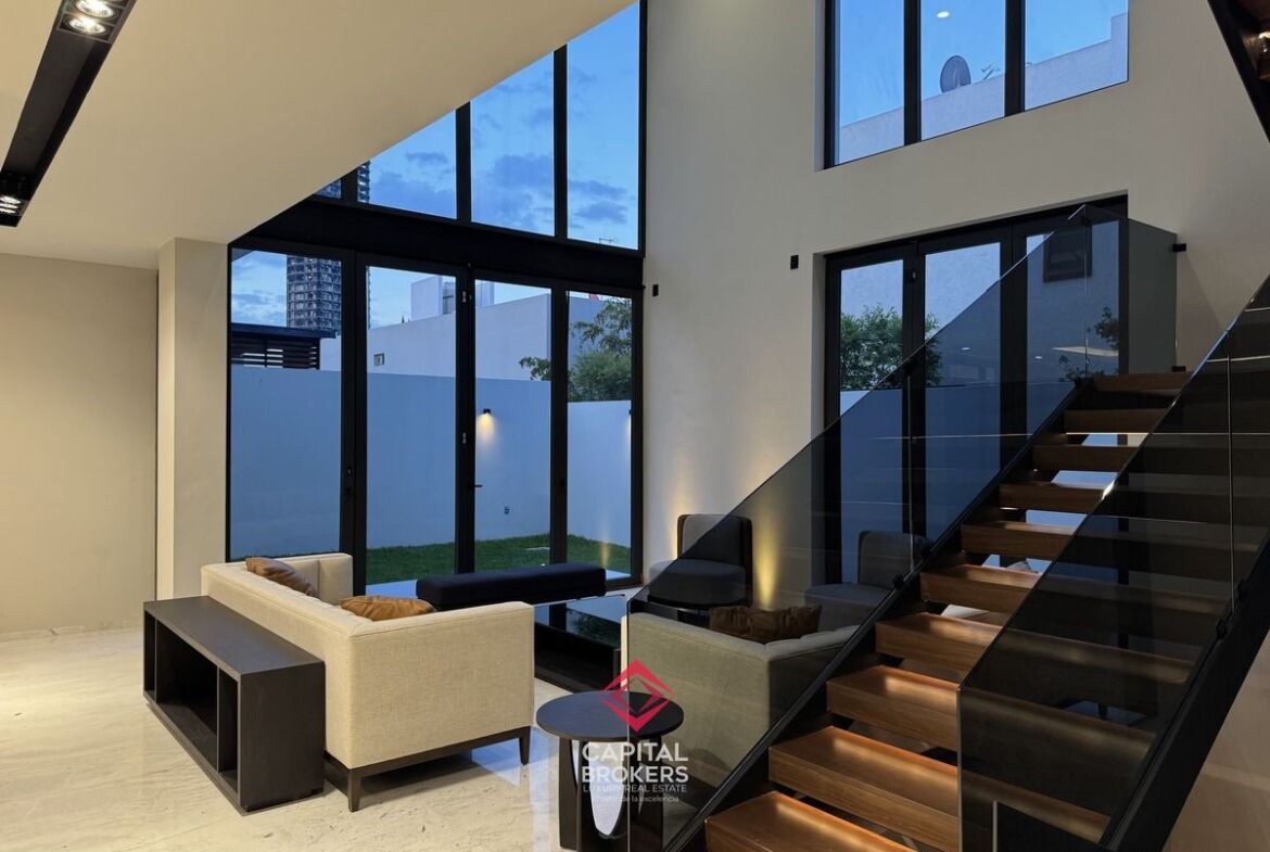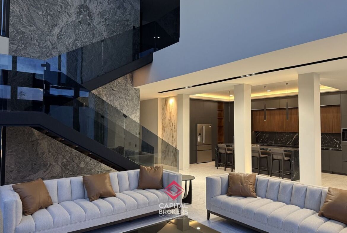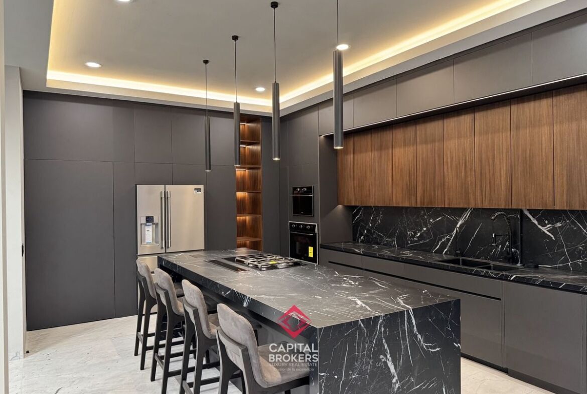 Amplia Sala a Doble Altura, cocina equipada con equipos de alta calidad, diseño moderno, barra desayunador con 6 espacios, comedor, terraza y jardín
