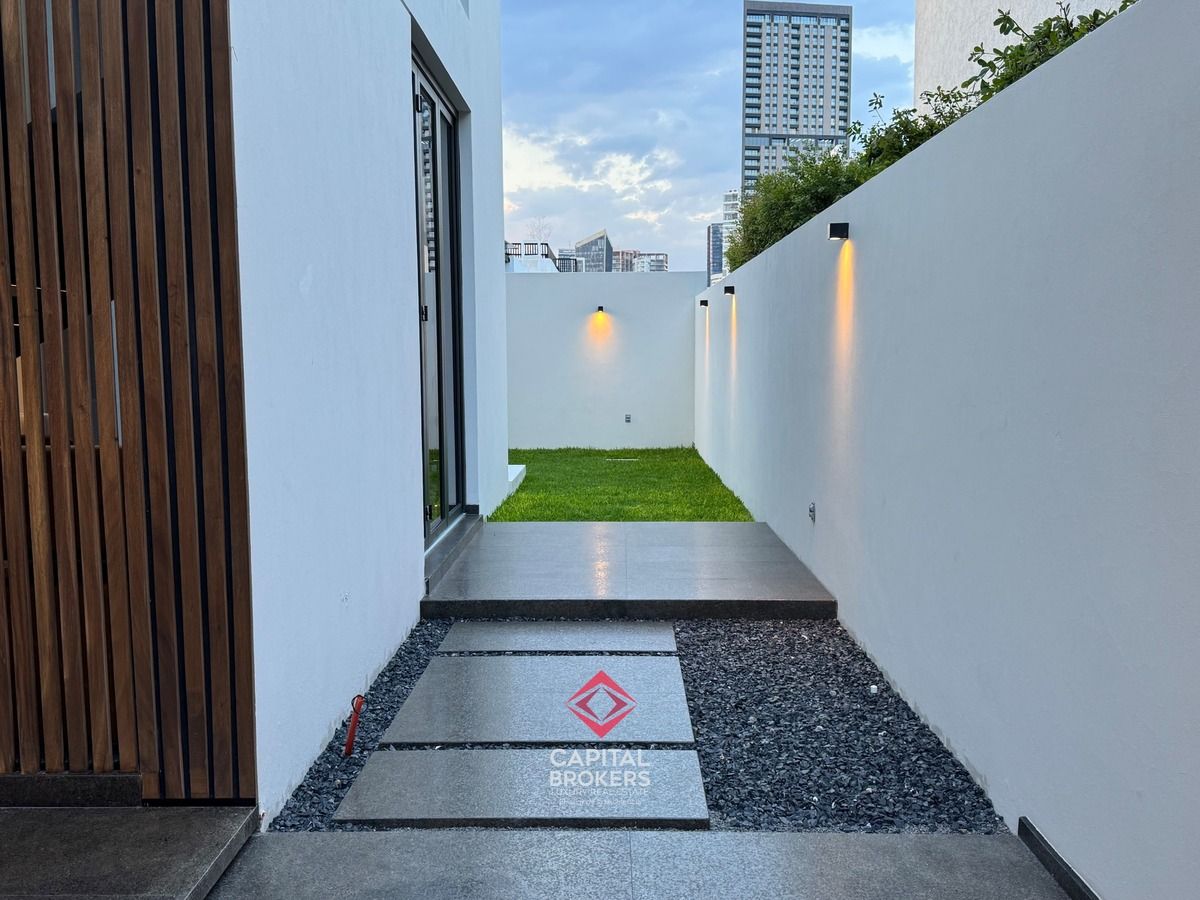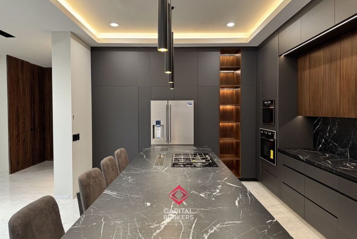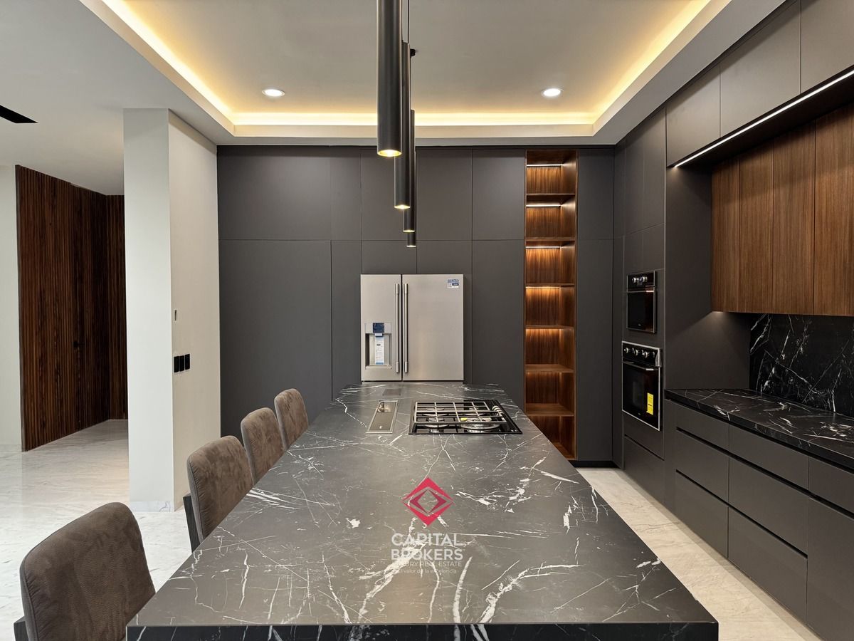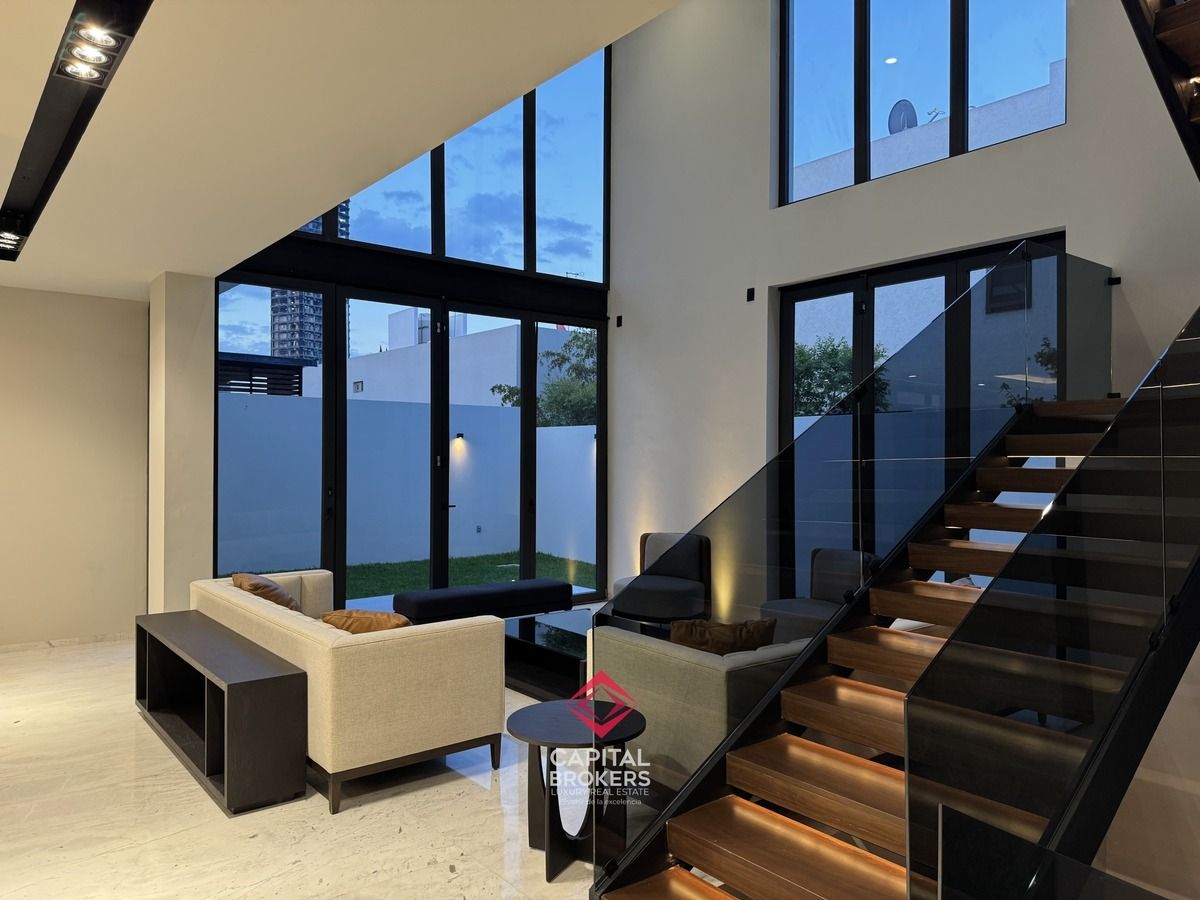 Amplia Sala a Doble Altura, cocina equipada con equipos de alta calidad, diseño moderno, barra desayunador con 6 espacios, comedor, terraza y jardín