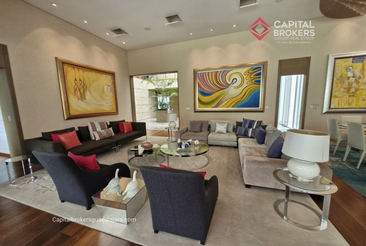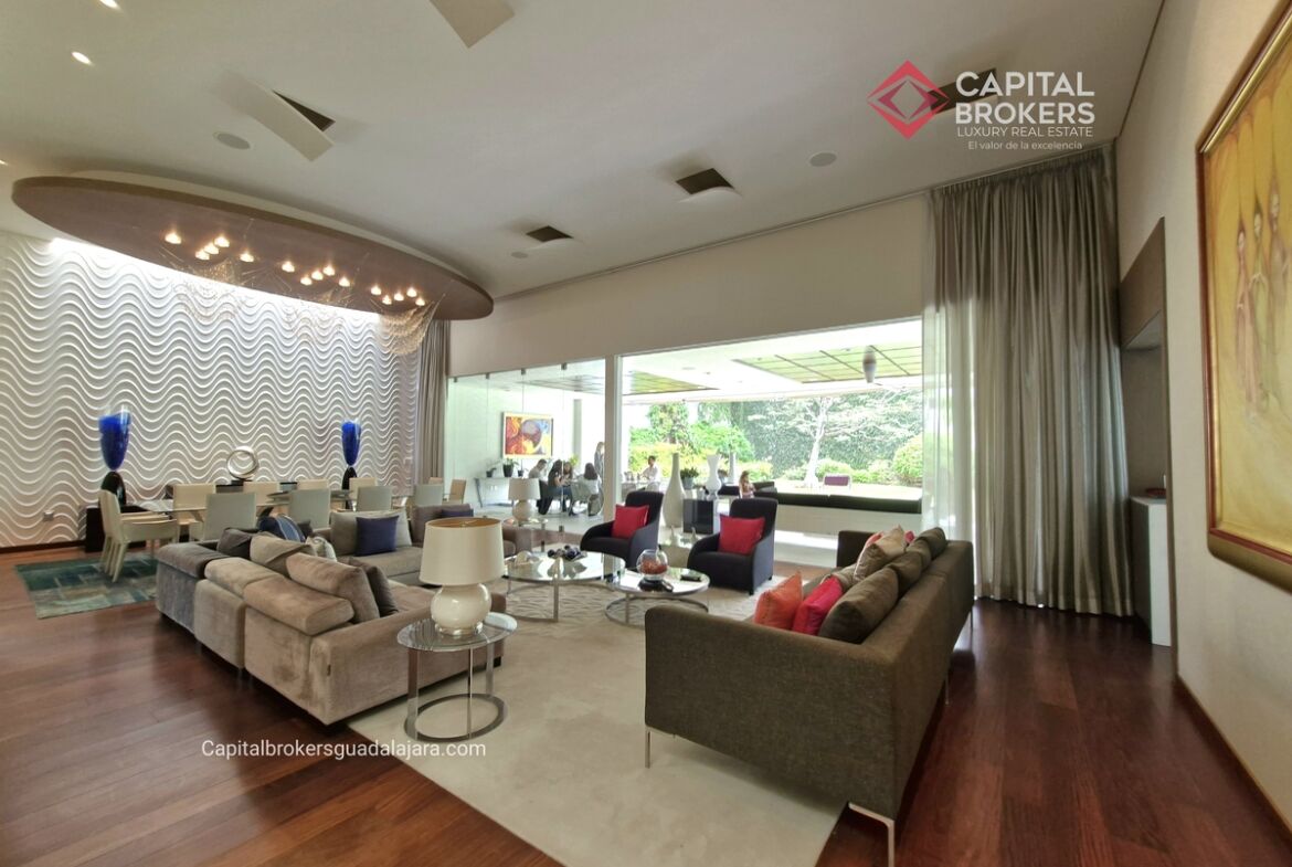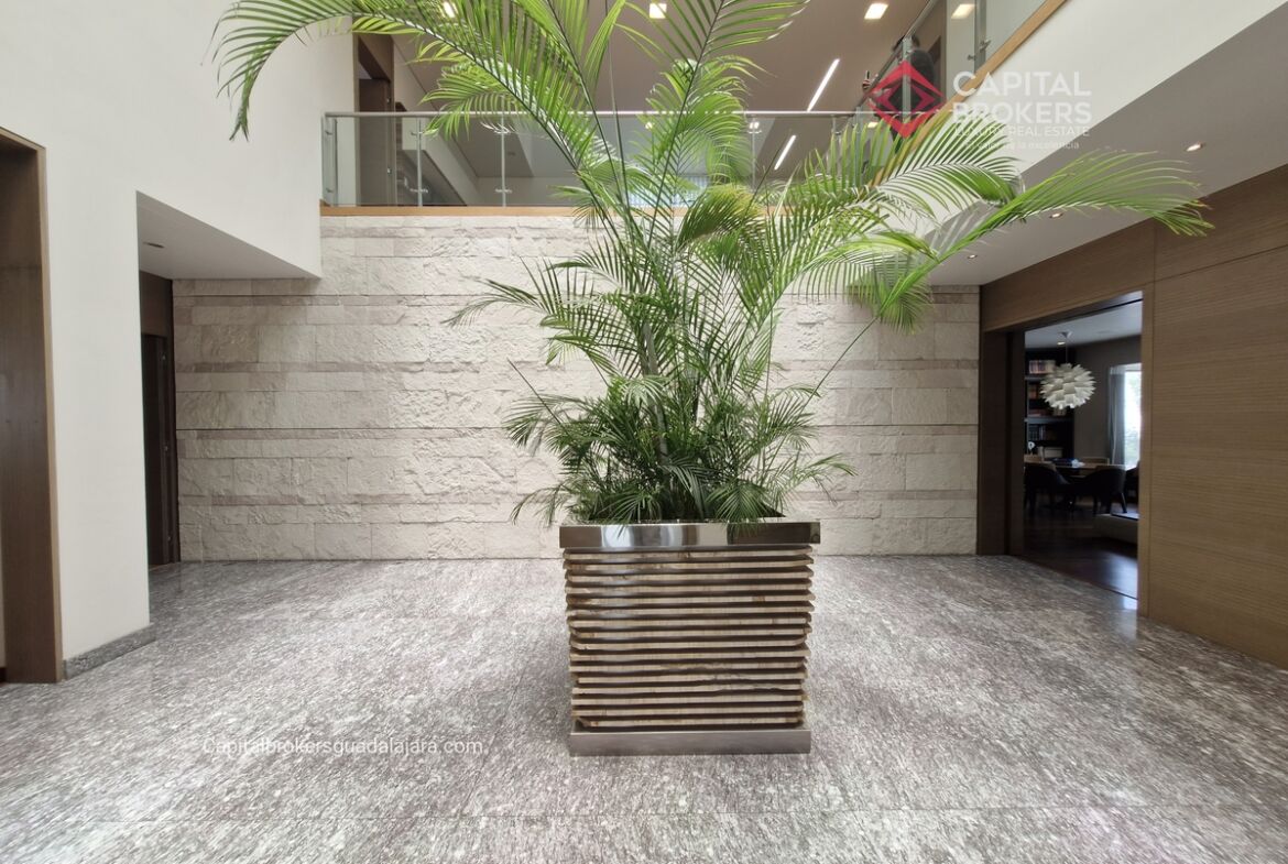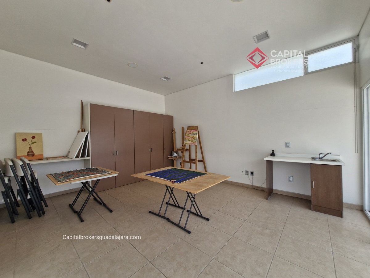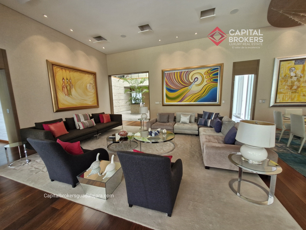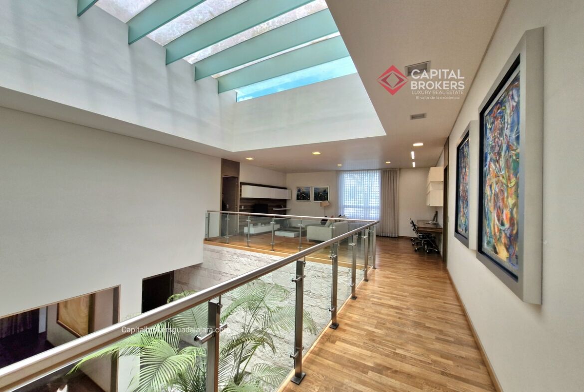 Planta Baja cuenta con estudio/oficina , Recamara Principal con walking closet y baño completo, Jardín , Terraza, Sala y comedor, antecomedor, cocina. 1/2 baño de visitas. Planta Alta: 3 recamaras, 2 de ellas con su baño completo y closet. 4ta recamara con closet y terraza., un estudio y terraza Sótano cochera para 8 autos, bodegas y cuarto de servicio con baño completo