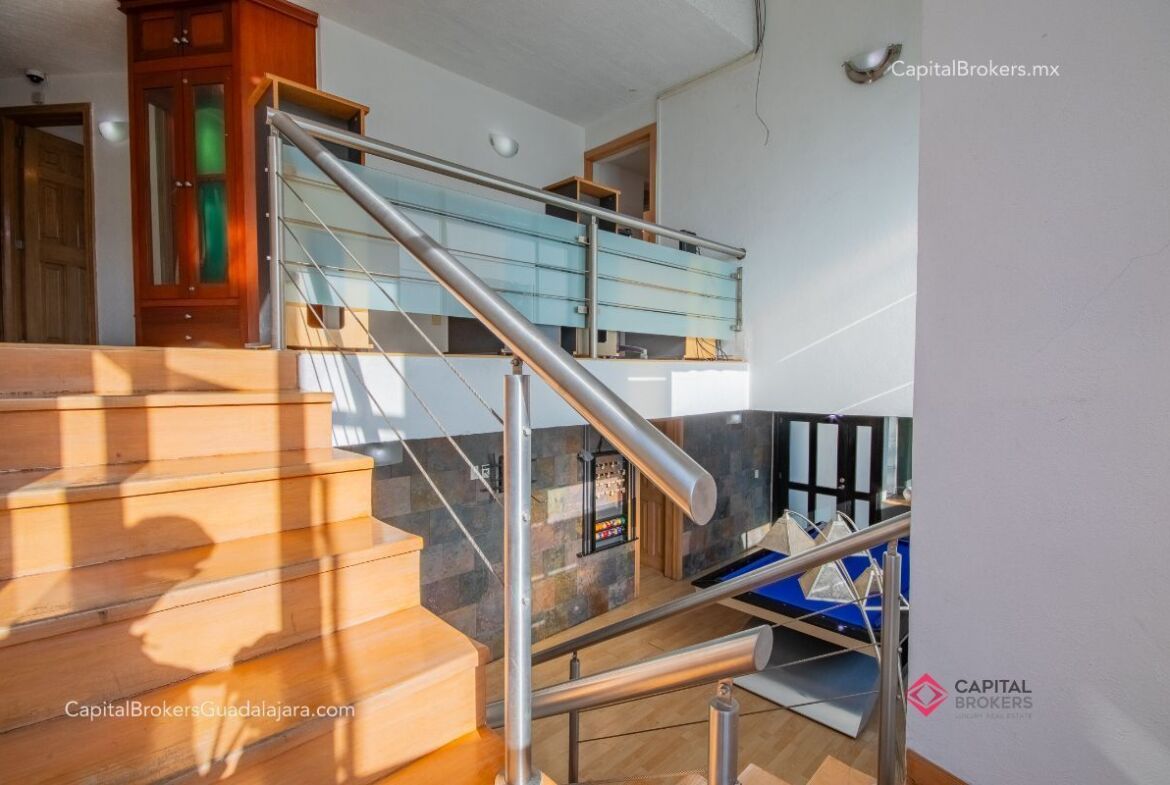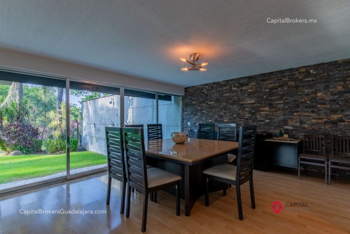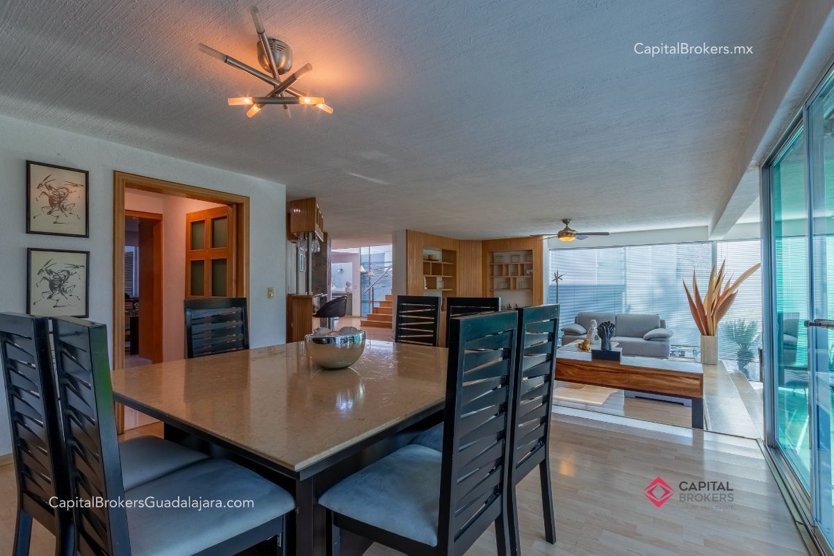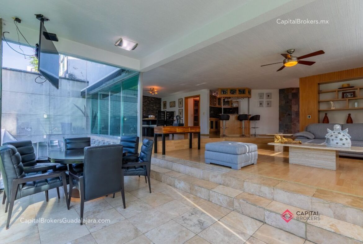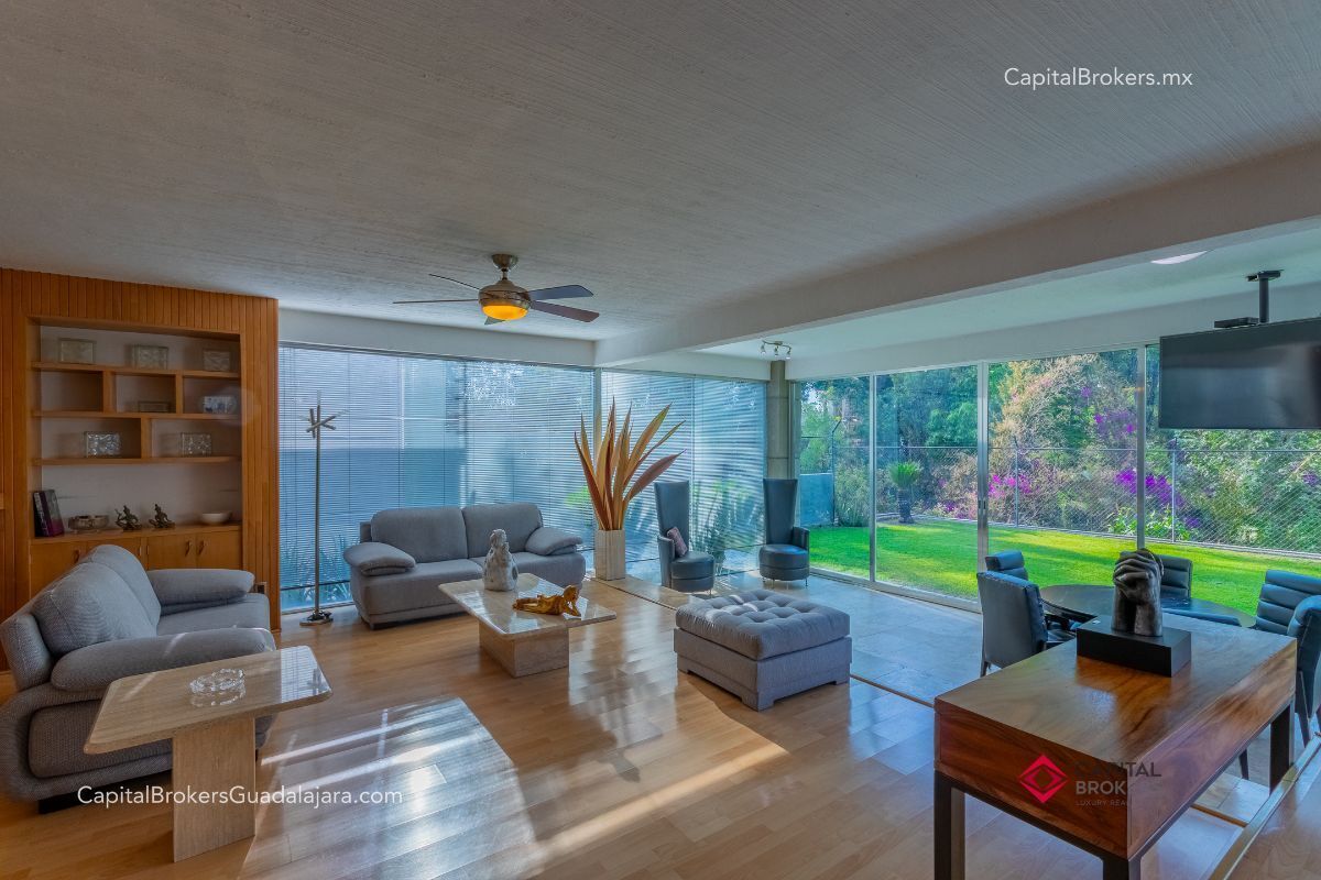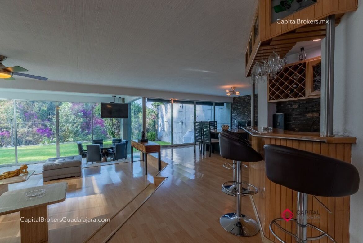 Planta Baja: cochera con portón eléctrico para 6 autos amplio e iluminado recibidor, medio baño de visitas, bodega pequeña, amplio comedor y sala en desnivel , ambos con espectacular vista a la cañada, amplio jardín con terraza con toldo retráctil con
