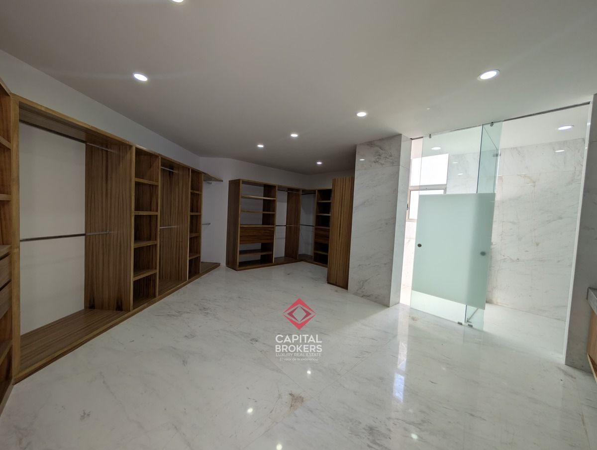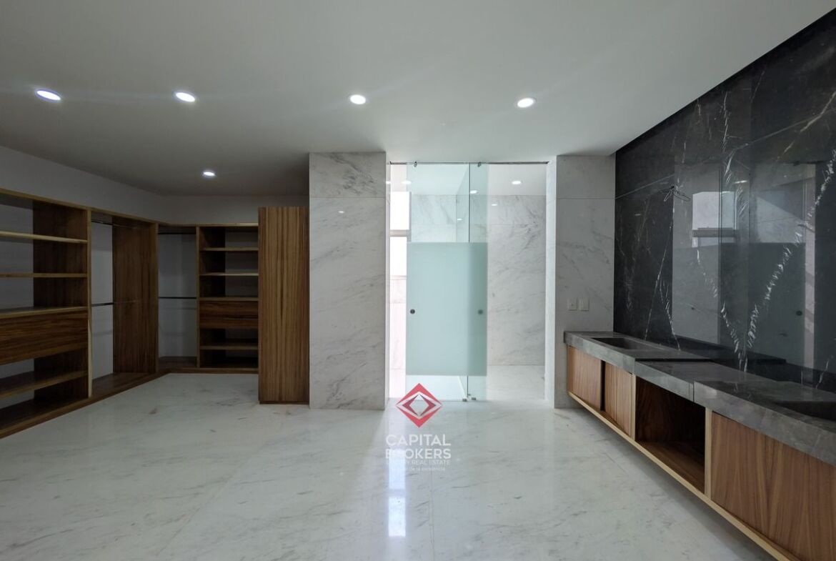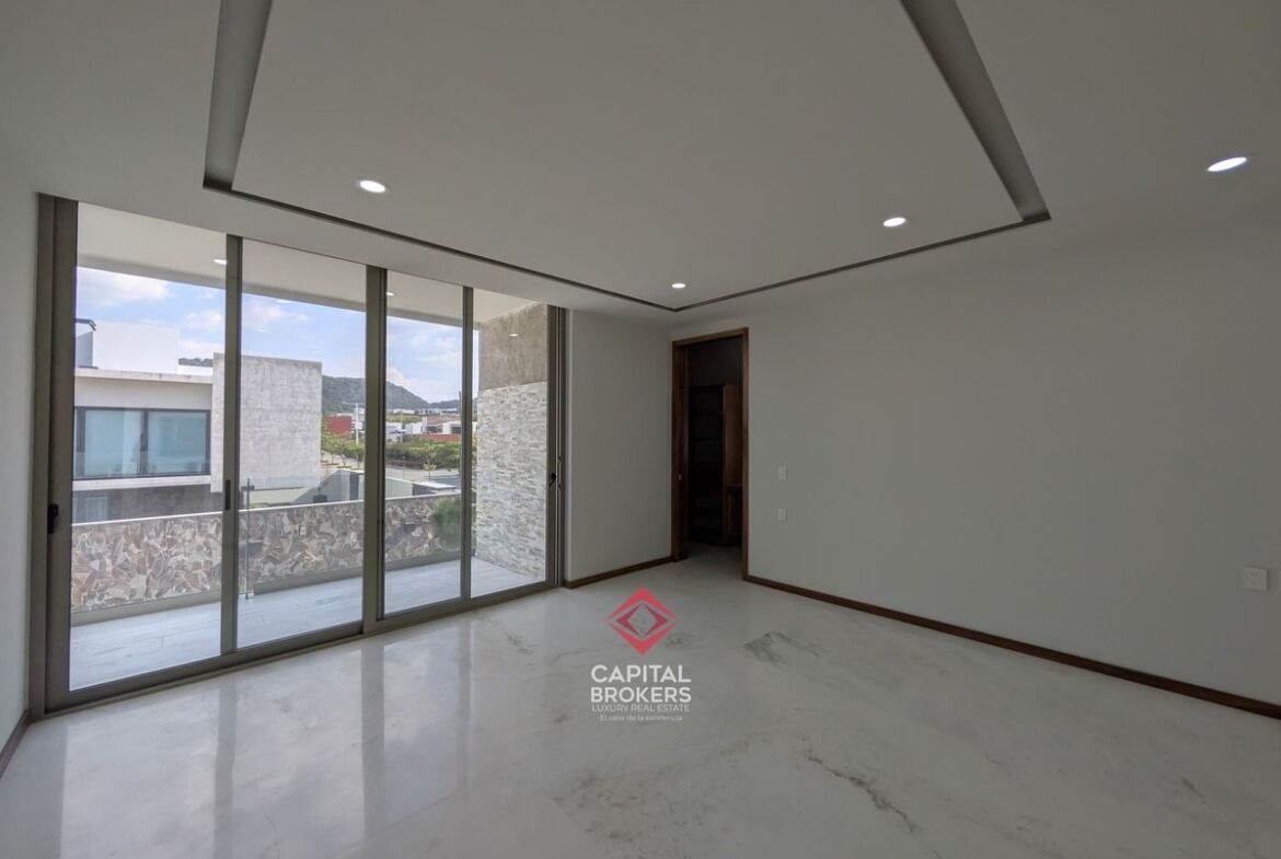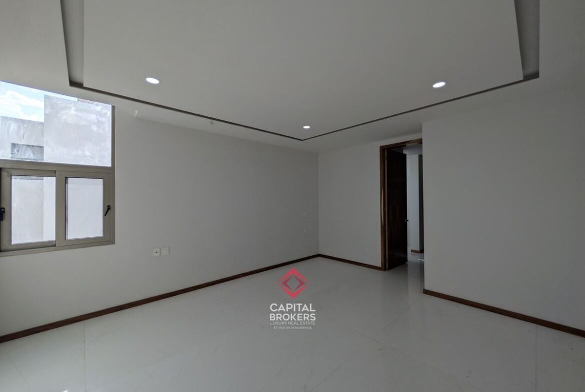 Planta alta: recámara principal con baño completo, jacuzzi y walk-in closet, así como tres recámaras secundarias con baño completo y vestidor, y una estancia.