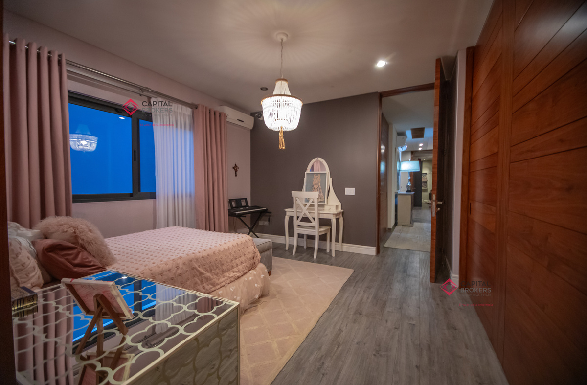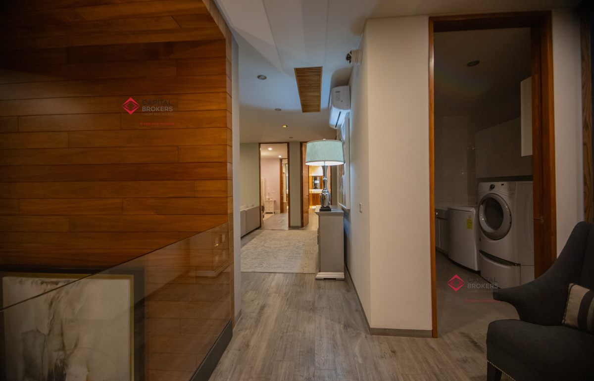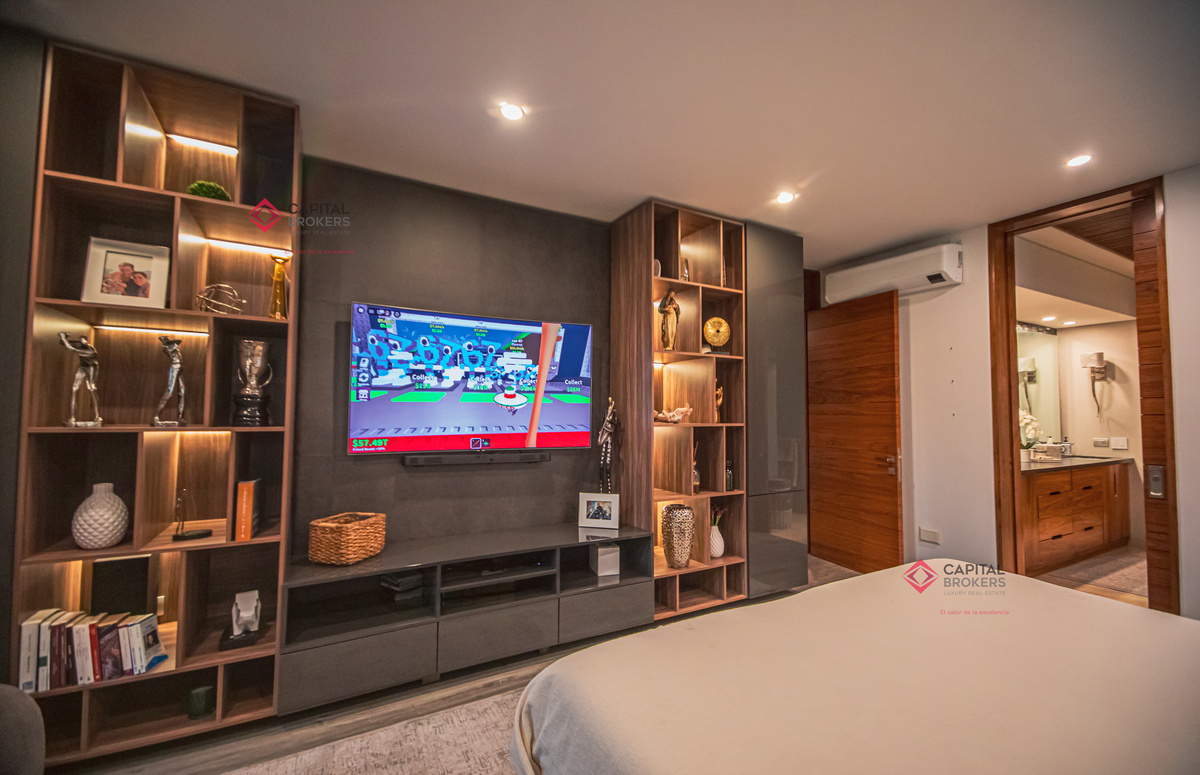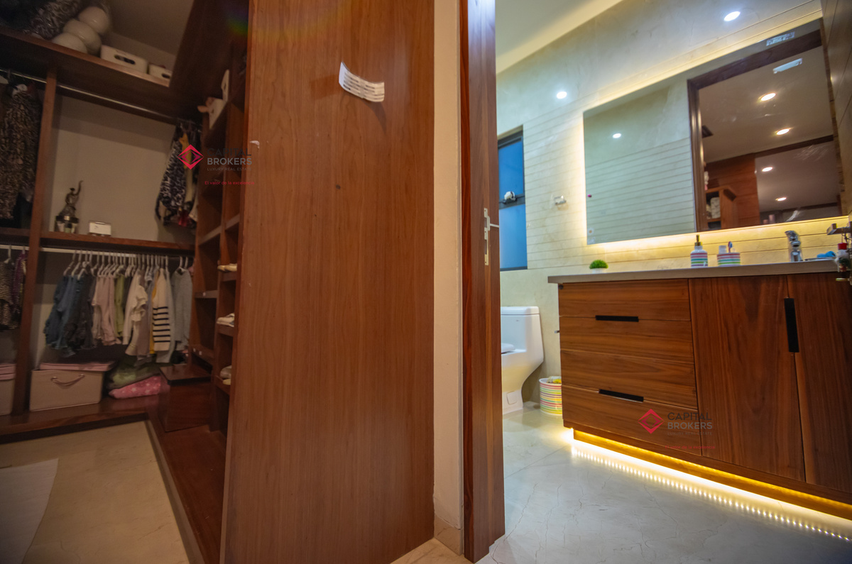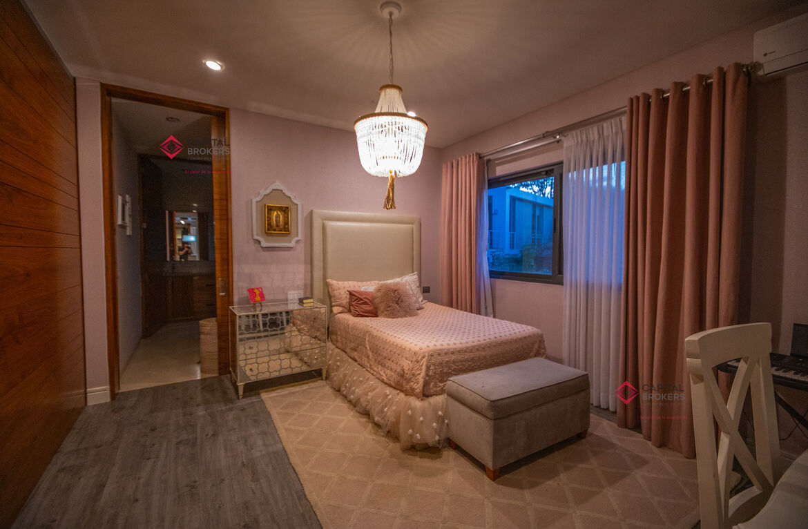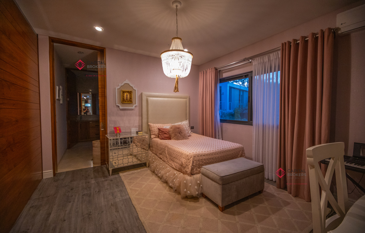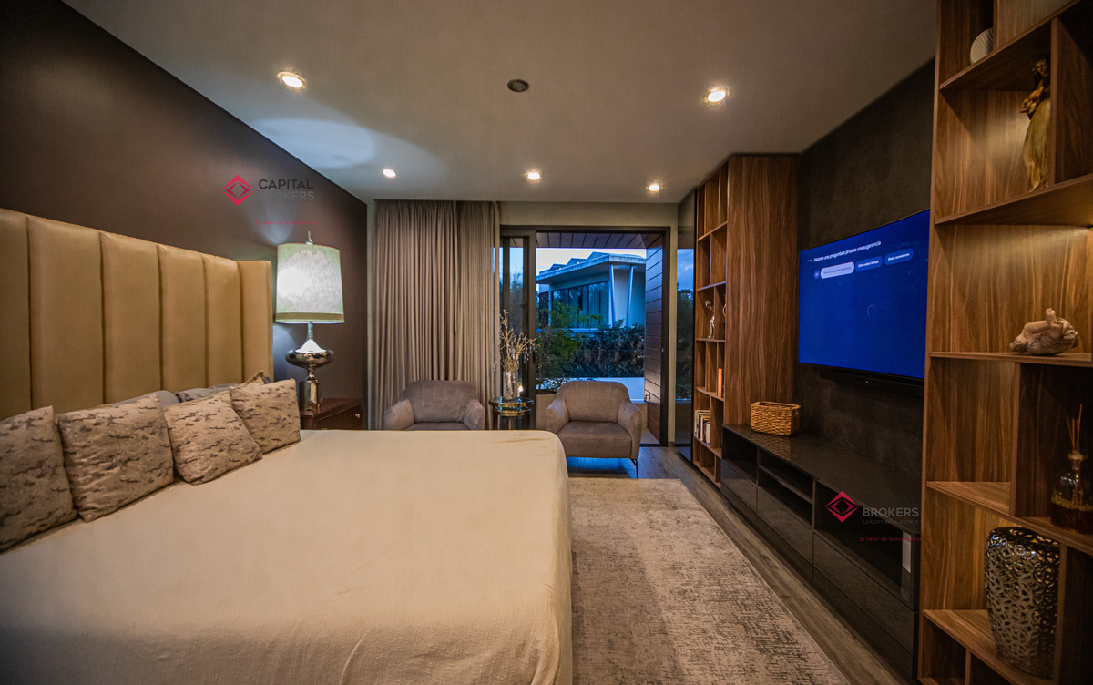 Recamara principal con excelentes espacios, baño completo y amplio vestidor, 3 recámaras, cada una con baño completo y vestidor cada una de ellas, acogedora sala de televisión, lavandería con patio de servicio