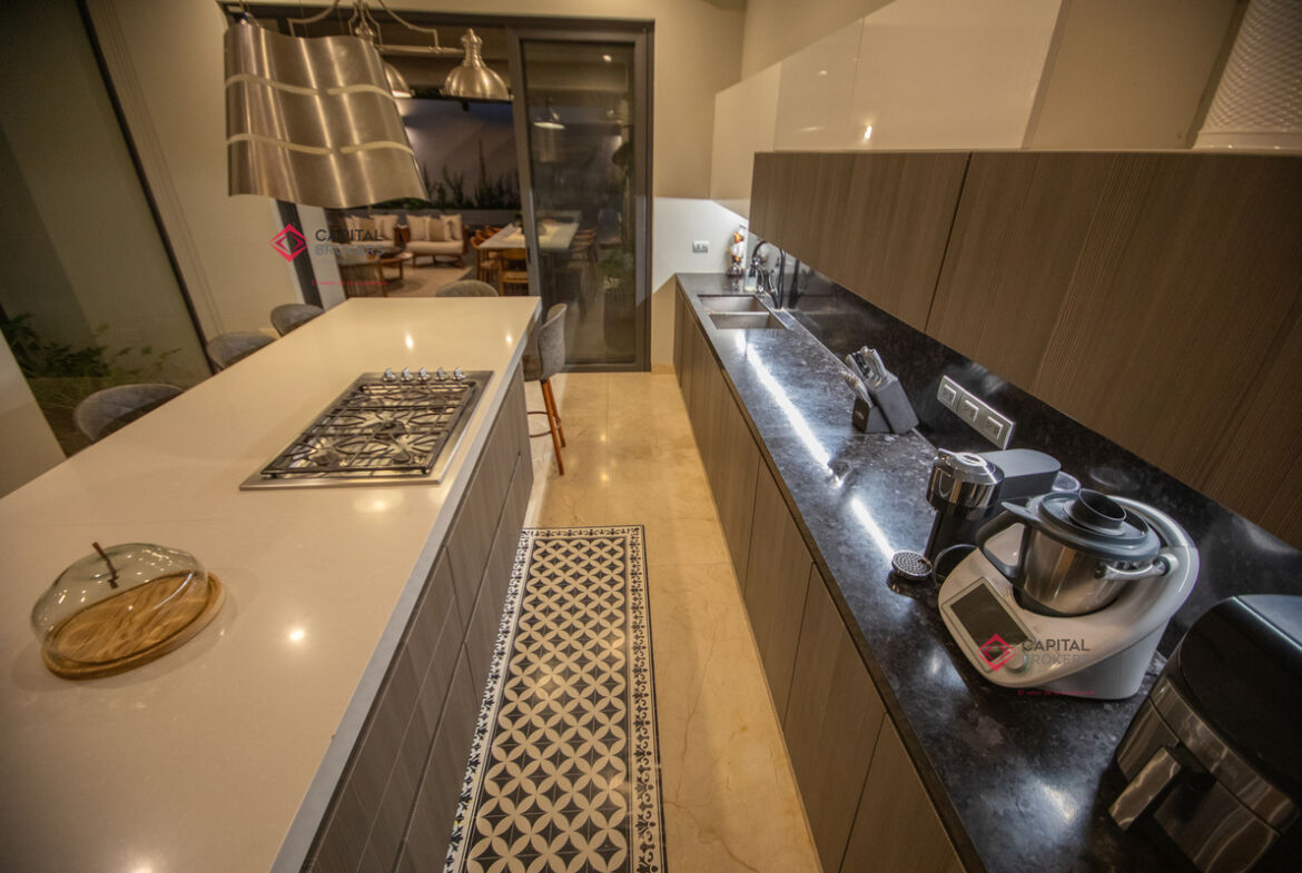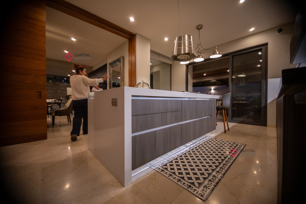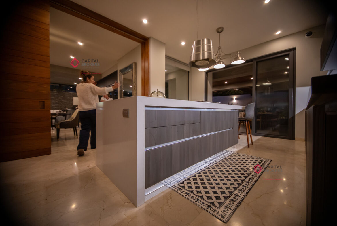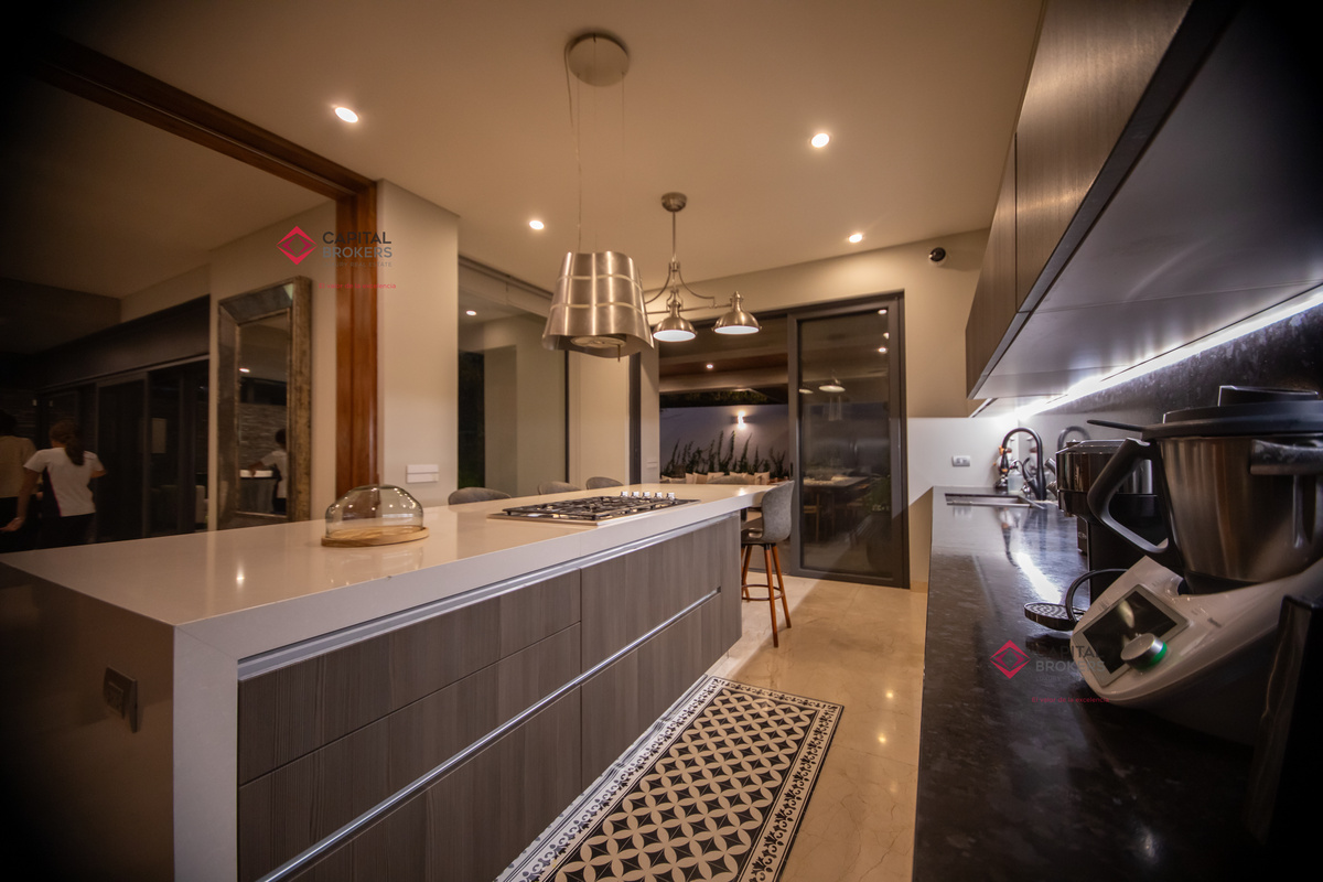 Cocina integral equipada con cuarto de despensa que se integra de una forma elegante al comedor y a la terraza con su elegante pérgola.