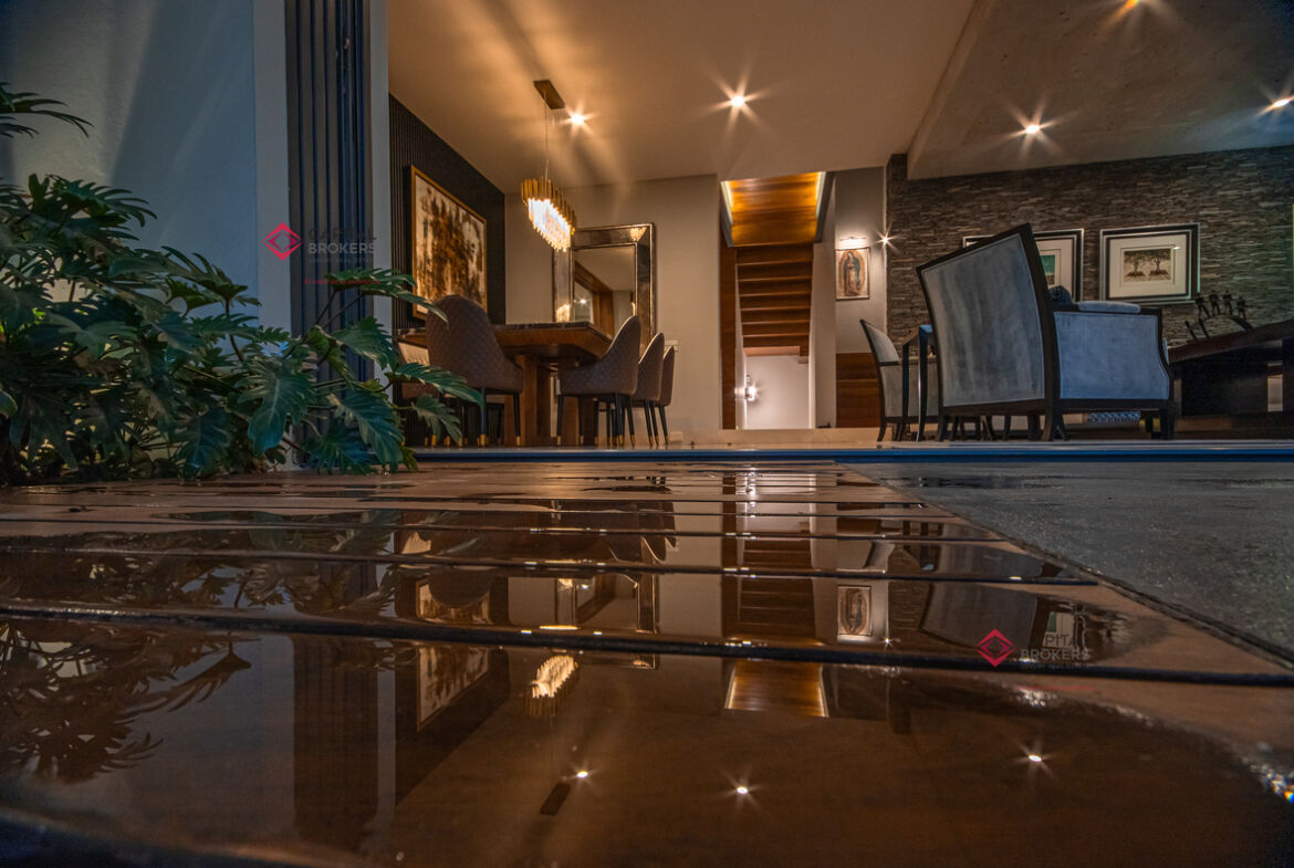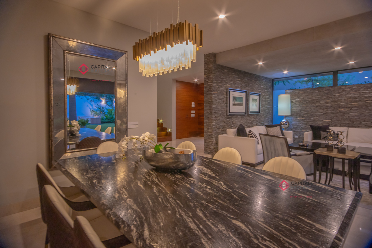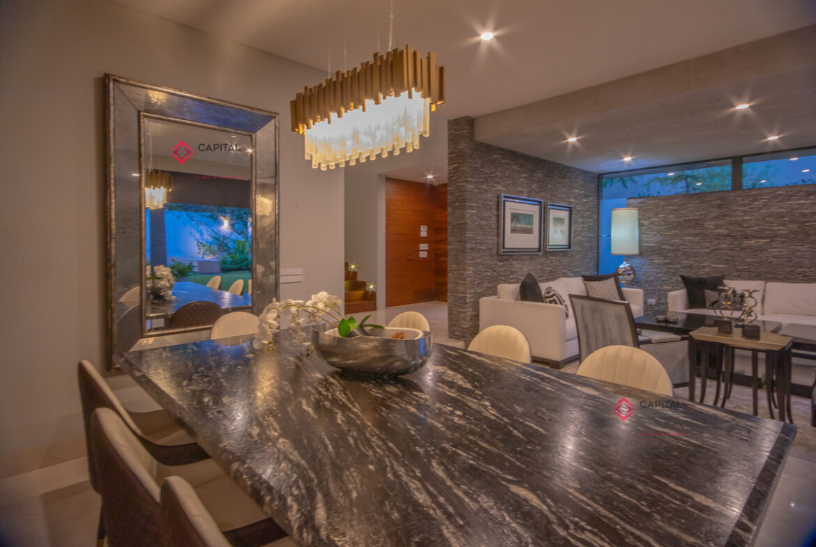 Amplia sala y comedor, donde se integra con la terraza al abrir la amplia ventana, la cual se recorre y se esconde y da una vista maravillosa a la terraza y alberca, un ambiente para disfrutar en familia y amistades.